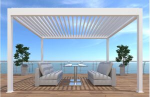 La pergola c’est avant tout un abri extérieur, la pergola bioclimatique est équipée d’un toit à lames orientables (souvent en aluminium). Elle permet de réguler naturellement l’ensoleillement, la ventilation ainsi que la protection contre la pluie.