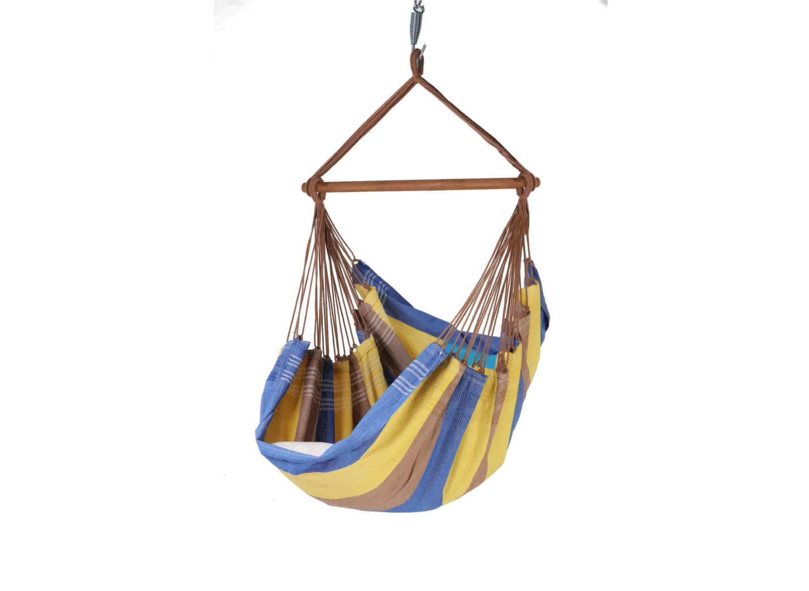 Hamac chaise | Coton avec bois | "Juriti" : Moka, Jaune, Bleu