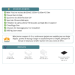 - ✅ Toute équipée (couverture, système de désinfection UV, spot chromothérapie, filtres, pompe de circulation, chauffage, buses de massage),