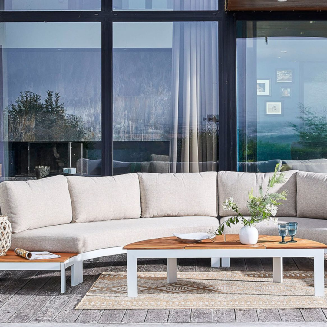 Le salon de jardin Rhonda est composé d’une méridienne et d’une table basse. Le Rhonda est un set accueillant et moderne avec des coussins épais et des dossiers rembourrés pour proposer un salon lounge général dans un jardin ou en bord de piscine. La structure du Rhonda est en aluminium époxy, la table basse en forme de 1/2 lune et les deux tablettes en bout de méridienne sont ornées d’un plateau teck.